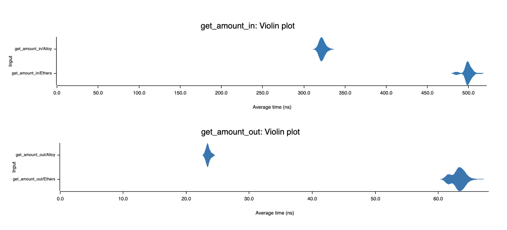 We compare the performance of both get_amount_in and get_amount_out. Benchmark indicates ~1.5x-2x improvement when using Alloy types!